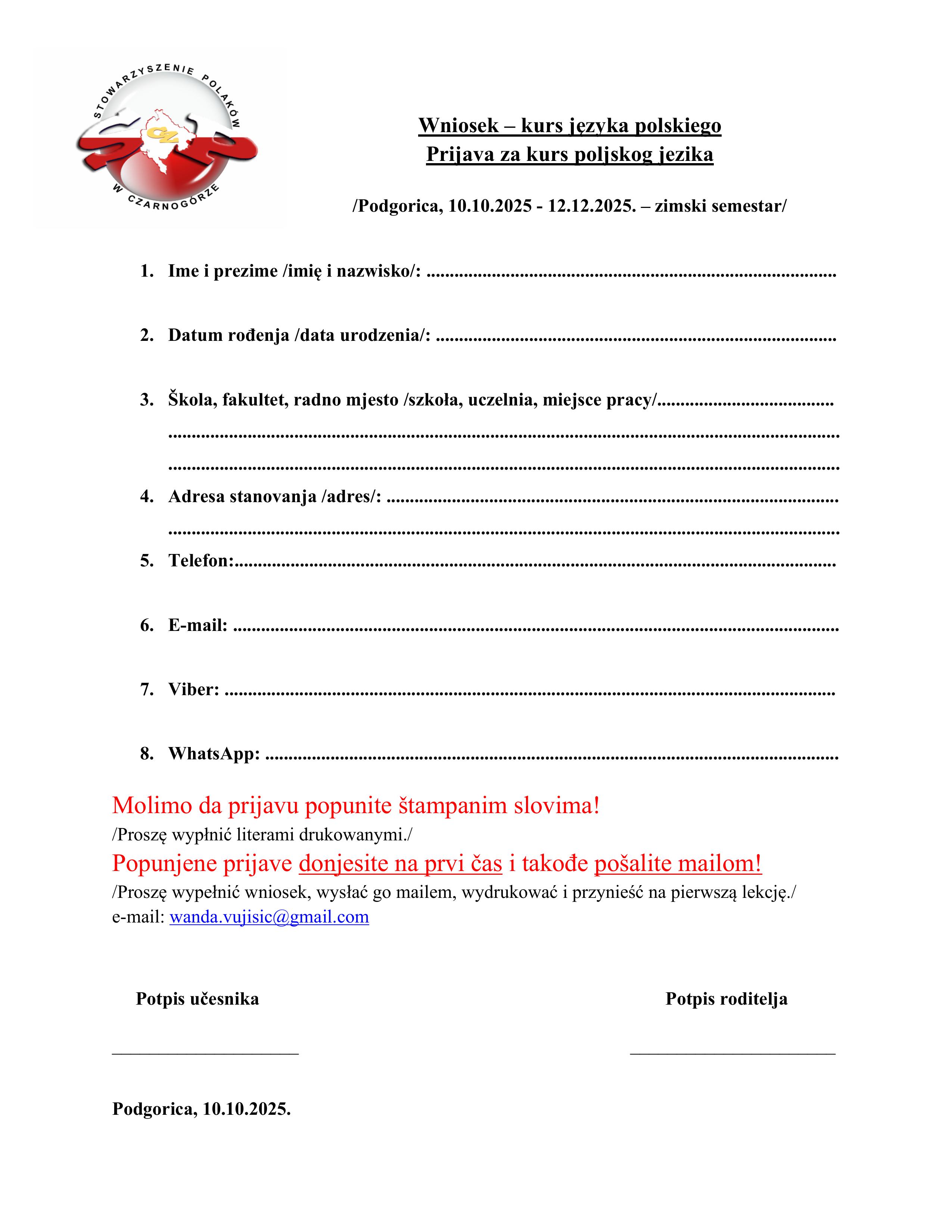 Ambasada Republike Poljske u Podgorici i Udruženje Poljaka nastanjenih u Crnoj Gori organizuju još jedan u nizu besplatan kurs poljskog jezika. Kurs je namijenjen početnicima (A1) i onijima koji su završili nivo A1, osobama starijim od 15 godina, studentima, zaposlenima i svim ljubiteljima poljskog jezika, kulture i istorije. Kurs će se održavati svakog petka od 17:00 do 19:30 časova u prostorijama Centra za obrazovanje i odgoj Don Bosko u Podgorici, ul. Zagrebačka 3 (ulaz sa druge strane crkve).