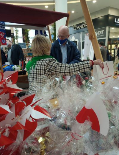 Przyciągnęło ono kupujących, swoimi tradycyjnymi, polskimi ozdobami i małymi noworocznymi prezencikami. W tym roku było ono trochę skromniejsze z powodu Covida-19, ale wszyscy bardzo chętnie go odwiedzali i pytali o polskie czekolady, ptasie mleczko,pierogi, bigos... No, niestety tych produktów w tym roku nie było na naszym stoisku.