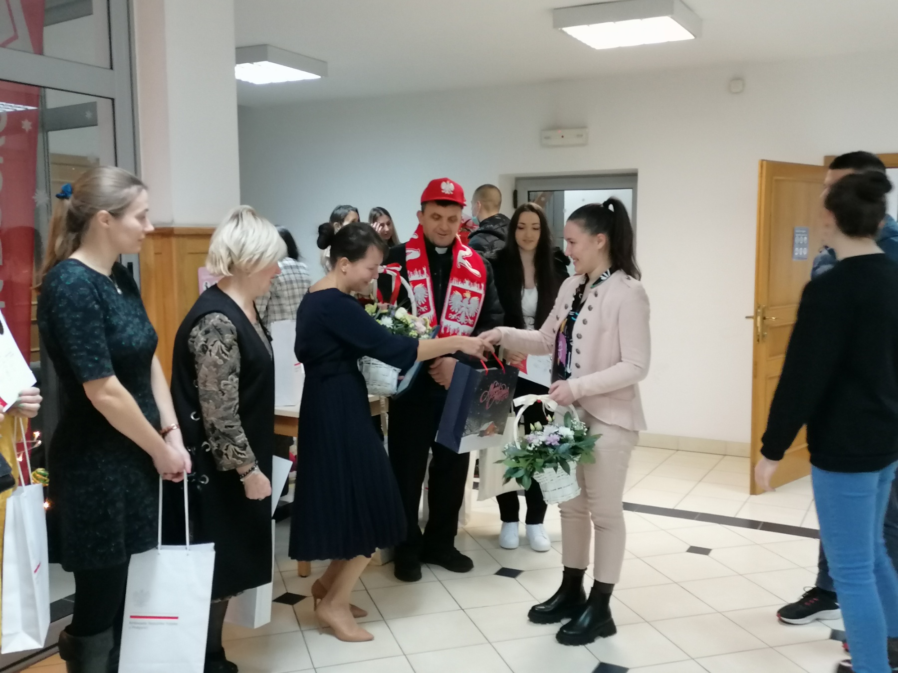 Na zakończenie spotkania słowa podziękowania pani konsul skierowała również do lektorek. Wyraziła ona wielkie zadowolenie z prowadzenia kursu i dodała, że bez zaangazowania p.Wandy i p.Marty organizacja kursu nie byłaby możliwa. Podziekowała również i dyrektorowi szkoły Don Isidoru Lukiću i uhonorowała go polska czapką i szalikiem.