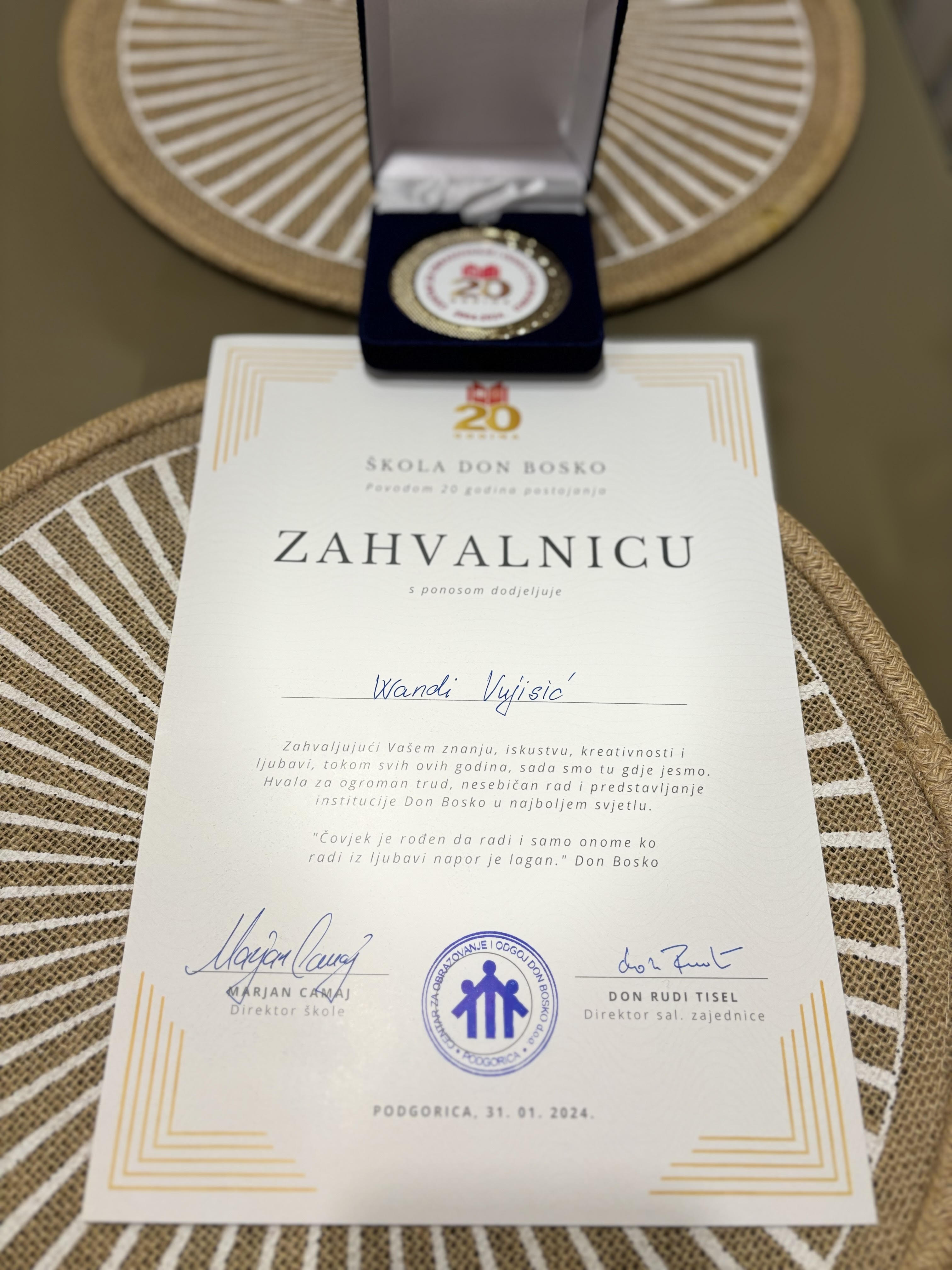 Povodom 20. godina postojanja dir. salezjanske zajednice Don Rudi Tiseo i dir. škole Marian Camaj uručili su Zahvalnice i medale za ogroman trud, nesebičan rad i predstavljanje školu Don Bosko u najboljem svjetlu, i to: gospodinu Andžeju Papiežovi, ambasadoru Poljske u Crnoj Gori, Malgožati Lakoti-Micker, konzulu Poljske i Vandi J. Vujisić, dugogodišnjem lektoru poljskog jezika u pomenutoj školi.